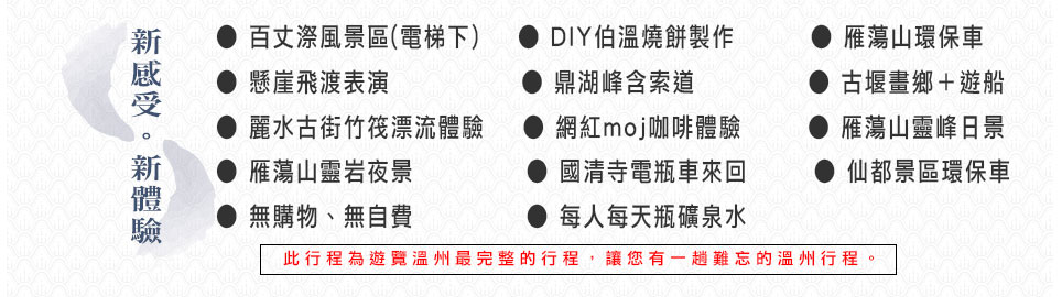 ※ 以上行程如有老人、小孩之門票一概不退 ※ 【報名注意事項】 1. 訂金每席機位NT15,000 元。 2. 旅客報名繳交訂金後,取消退費等相關旅遊規範依據觀光局公佈之【國外旅遊定型化合約書】。 3. 行程報價為2人一室,如貴賓為單1人報名,若無法覓得合住的同性旅客,則需另補單人房差額,敬請見諒! 4. 行程無法延長住宿天數、更改日期及航班,旅客若中途脫隊,視同自願放棄,恕不另外退費。 5. 特殊餐食或需求者,請於報名時一併告知。 6. 年滿70歲以上或行動不便之貴賓,為考量旅客自身之安全,並顧及其它團員之權益,必須有家人或友人同行, 否則恕不接受報名。 7. 旅遊疾病、延遲險等非旅責險含括範圍的保險費用。 8. 為了本次各位貴賓行程愉快順利,旅遊行程住宿及旅遊點儘量忠於原行程,有時會因飯店確認行程前後更動或 互換觀光點,若遇特殊情況或其他不可抗拒之因素以及船、交通阻塞、觀光點休假,本公司保有變更班機、行 程及同等飯店之權利與義務,不便之處,尚祈見諒!